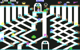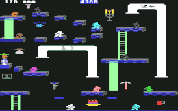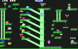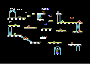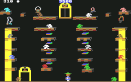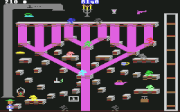 Einige schöne bunte Level-Bilder aus dem Spiel, mit Elementen wie Plattformen, Rutsche, Fahrstühle, usw. - passend für ein Jump & Run-Spiel der frühen 1980'er Jahren: