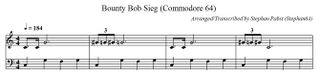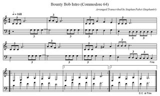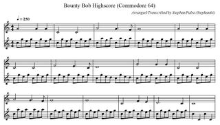 Die musikalische Untermalung von "Bounty Bob" besteht aus drei zweistimmigen Liedern, die während des Intro (linkes Bild der nachfolgenden Galerie), nach dem letzten Level (mittleres Bild) und während der Anzeige der Highscore-Liste (rechtes Bild) wiedergegeben werden; zudem erklingt beim Start jedes Levels eine von vier kurzen, einstimmigen Melodien. Für eine kreative Weiterverwendung stehen die Noten aller Musikstücke auch als PDF-Dokument (Datei:BountyBob Theme PDF.pdf) und in der ABC-Musiknotation (Datei:BountyBob Theme.abc.txt) zur Verfügung.