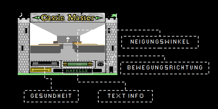 Das Spiel ist komplett in einer berechneten 3D-Vektorlandschaft gestaltet, die in der Mitte des Bildschirms angezeigt wird und durch die sich der Spieler in der Ego-Perspektive bewegt. Im unteren Teil des Bildschirms befindet sich ein Textfeld mit kurzen Raumbezeichnungen, sowie die Anzeige der Lebenspunkte. Oben wird ein Logo mit dem Titel Castle Master angezeigt, während der Spielausschnitt rechts und links von zwei grafischen Türmen begrenzt wird.