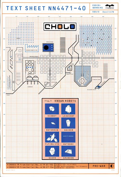 Dem Spiel liegt eine Karte aus der Zeit vor dem Krieg (aus dem März 2611) bei, auf die sich alle Ortsangaben in der nachfolgenden Beschreibung beziehen (siehe Abschnitt "Zubehör"). Die nachfolgende Illustration zeigt eine verkleinerte Version dieser Karte, in die die Positionen aller Computer (grün) sowie die Orte, an denen sich die im Spiel benötigten Roboter üblicherweise finden lassen (rot), eingezeichnet sind. Ein blauer Hinweis zeigt zudem den Eingang zum Atomschutzbunker, in dem die Einwohner von Cholo gefangen sind.