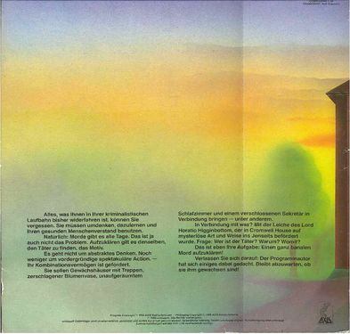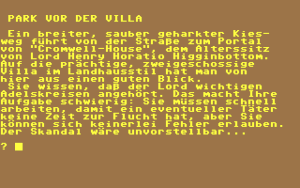 Ein Krimi-Adventure (nur Text, keine Bilder), mit guten, teilweise witzigen Texten und Gags und einigen kniffligen Rätseln. Nachfolgend zwei Texte aus dem Adventure: