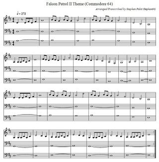 Das nachfolgende Bild zeigt die Startmelodie in der üblichen Notenschreibweise. Für eine kreative Weiterverwendung stehen die Noten auch als PDF-Dokument (Datei:FalconPatrol2 Theme PDF.pdf) und in der ABC-Musiknotation (Datei:FalconPatrol2 Theme.abc.txt) zur Verfügung.