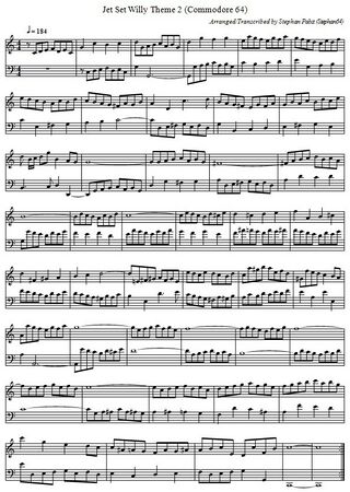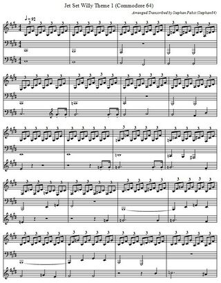 Die nachfolgende Galerie zeigt die erste Seite der Titelmelodie sowie die musikalische Untermalung in der üblichen Notenschreibweise. Für eine kreative Weiterverwendung der Melodien stehen die vollständigen Noten auch als PDF-Dokument (Datei:JetSetWilly Theme PDF.pdf) und in der ABC-Musiknotation (Datei:JetSetWilly Theme.abc.txt) zur Verfügung.