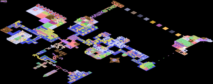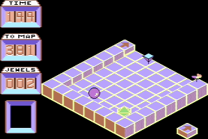Nach dem Drücken der Taste M sehen Sie eine Karte der Spindizzy-Welt (Norden ist oben). Kartographiert wird automatisch während des Spiels. Die Zeit wird während Sie sich die Karte ansehen, nicht vermindert. Zum Weiterspielen eine beliebige Taste drücken.