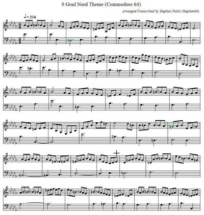 Das nachfolgende Bild zeigt die Titelmelodie in der üblichen Notenschreibweise. Für eine kreative Weiterverwendung der Melodie stehen die Noten auch als PDF-Dokument (Datei:0GradNord Theme PDF.pdf) und in der ABC-Musiknotation (Datei:0GradNord Theme.abc.txt) zur Verfügung.