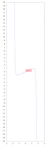 Die folgenden beiden Schaubilder zeigen den Graphen dieses Polynoms (violett). In beiden Bildern ist das Intervall, das von der ATN-Routine genutzt wird, hellrot eingefärbt. Im rechten Bild ist zudem der Verlauf der Arkustangens-Funktion (grün) zum Vergleich eingezeichnet.