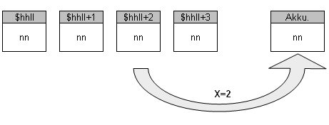 Beispiel: LDA $hhll, X[Bearbeiten | Quelltext bearbeiten]