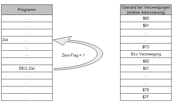 aufgefasst wird und zum Programmzähler (bezogen auf den folgenden Befehl) addiert wird. Überschreitet dabei die Berechnung eine Page-Grenze fällt bei der Ausführung ein Extratakt an.