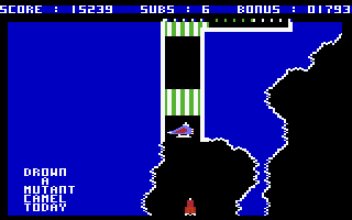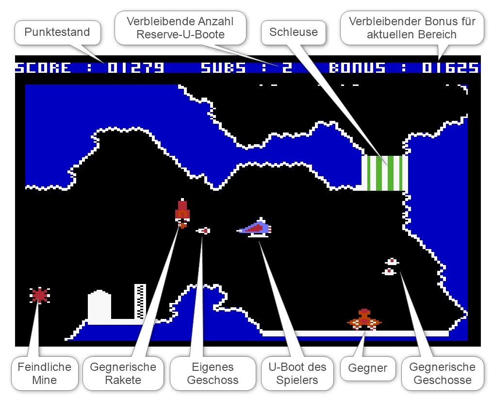 Alle Bildschirminhalte werden im Multicolor-Textmodus angezeigt (Video-RAM an Adresse $0400). Der Zeichensatz für die Elemente des Unterwasserlabyrinths ist an Adresse $0800 zu finden; für die Statuszeile am oberen Bildschirmrand wird kurzzeitig per Rasterzeilen-Interrupt auf einen zweiten Zeichensatz an Adresse $3000 umgeschaltet. Das vom Spieler gesteuerte Unterseeboot wird durch Sprite 0 dargestellt, eigene Geschosse durch Sprite 1. Die weiteren Sprites werden für Gegner und gegnerische Geschosse verwendet. Schleusen, die periodisch Durchgänge blockieren, sind in die Textdarstellung eingearbeitet. Bei der Erkennung von Treffern und Zusammenstößen mit Gegnern verlässt sich das Spiel auf die Sprite-Sprite-Kollisionserkennung des VIC (Register an Adresse $D01E), für eventuelle Berührungen mit Felsen und Schleusen auf die Sprite-Hintergrund-Kollisionserkennung (Register an $D01F).