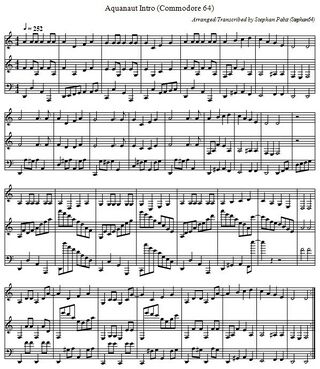 Während der Titelbildschirm dargestellt wird, erklingt eine dreistimmig das Lied "What shall I do with a drunken sailor". Das Spiel wird dagegen abwechselnd von zwei zweistimmigen Melodien begleitet, so dass ein Kanal des SID freibleibt für Geräusche, die das Spielgeschehen untermalen. Die nachfolgende Galerie zeigt diese Musikstücke in der üblichen Notenschreibweise. Für eine kreative Weiterverwendung stehen die Noten aller Melodien auch als PDF-Dokument (Datei:Aquanaut Theme PDF.pdf) und in der ABC-Musiknotation (Datei:Aquanaut Theme.abc.txt) zur Verfügung.