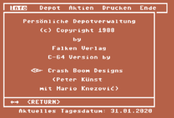 Mit der Taste F3 gelangen Sie in einer Datenbank zur persönlichen Depotverwaltung. Hierzu benötigen Sie ein leere, formatierte Diskette als Datendiskette!