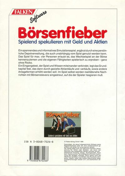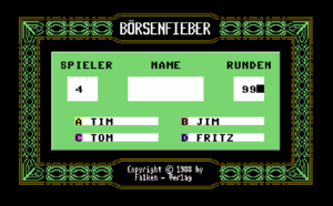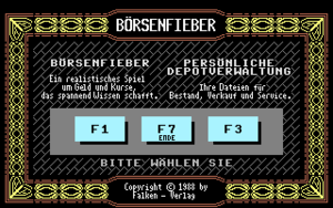 Die für damalige Verhältnisse interessante Wirtschaftssimulation Börsenfieber verfügt über einen eigenen Zeichensatz mit ansprechender Grafik, sowie Hintergrundmusik. So macht das trockene Thema des Aktienhandels etwas mehr Spaß.