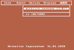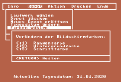 - Infothek: Übersicht der Bestände aller Spiele-Depots; weiter mit beliebigen Tastendruck.