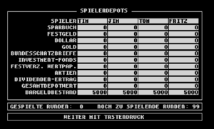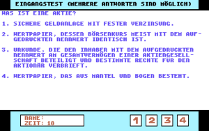 Danach erfolgt ein Multiplie-Choice-Test mit ca. 10 verschiedenen Fragen rund um den Aktienhandel. Die Fragen und deren Antworten werden 20s eingeblendet. Dann kann man mit den Zifferntasten 1 - 4 die entsprechend richtige Antwort eintippen und mit der Taste RETURN bestätigen. Je mehr Fragen richtig beantwortet werden, desto höher ist das Startkapital des Spielers (5.000 - 50.000 DM). Wenn alle Fragen beantwortet worden sind, startet das runden-basierte Spiel.