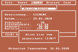 - Aktien verkaufen: Hierbei müssen angegeben werden die Anzahl (der Aktien) zum Verkauf. Danach wird der Menüpunkt durch Abspeicherung verlassen (Bestätigung mit J !).