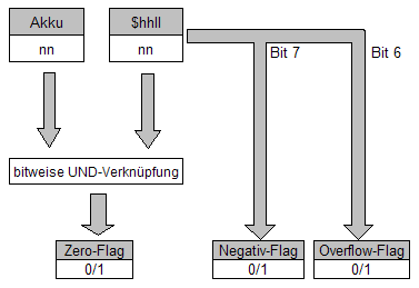 Der Assembler-Befehl BIT $hhll macht eine bitweise UND-Verknüpfung des Akkumulators mit dem Inhalt der Speicherzelle $hhll und setzt die Flaggen (Zero-Flag, Negative-Flag und Overflow-Flag) entsprechend.