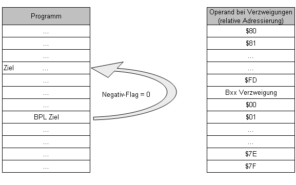 Der Assembler-Befehl BPL $hhll verzweigt zur Adresse $hhll (als neuer Wert des Programmzählers PC), wenn das Ergebnis der letzten Operation positiv ist, was mit Negative-Flag = 0 angezeigt wird.