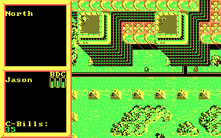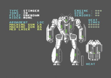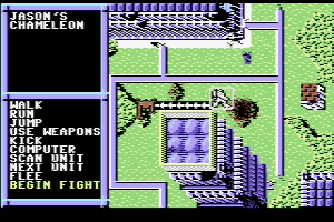 - Außerhalb des Kampfes bewegt man sich und seine Mechs mit dem Joystick über die Karte. Berührt man dabei den Eingang eines Gebäudes, so wird dieses betreten. Innerhalb der Gebäude erfolgt die Steuerung durch Auswahlmenüs. Diese können mit dem Joystick, oder mit den Cursor -Tasten und Return bedient werden. Drückt man im Bewegungsmodus auf der Karte die Space -Taste öffnet sich ein weiteres Menü: