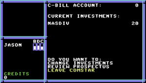 - Der Aktienhandel ist leicht zu durchschauen. Während die Wertpapiere der Computerfirma NasDiv und des Mech-Herstellers DefHas nur langsam steigen, dafür aber kaum fallen, ist der Medizinkonzern BakPhar für starke Kursschwankungen bekannt. Langfristig sollte man daher gleichmäßig in die ersten beiden Aktien anlegen. BakPhar eignet sich gut, um auf die Schnelle ein paar C-Bills mit der Taktik "speichern, nachschauen, evtl. neu laden" zu cheaten.