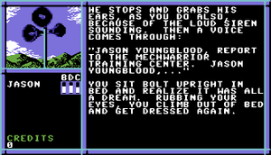 - Beim Angriff der Kuritaner hat Jason am C64 drei Jenner Mech als Gegner. Ein schwerer Kampf, aber wenn man geschickt um die zerbombtem Gebäude schleicht und die Kuritaner ausmanövriert, ist das durchaus zu schaffen. Bringt aber nichts, denn unabhängig davon ob man den Kampf gewinnt oder die Flucht ergreift, es geht in beiden Fällen mit der selben Zwischensequenz weiter. Unterschied zu PC und Amiga: Dort bekommt man gleich vier Jenner vorgesetzt. Das macht die Sache nochmal deutlich schwerer.
