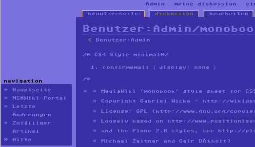Hier ein Bild von meinem Testwiki in den C64-Farben. Noch nicht ganz perfekt, aber fast