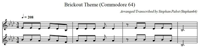 Das nachfolgende Bild zeigt die Titelmelodie in der üblichen Notenschreibweise. Für eine kreative Weiterverwendung der Melodie stehen die Noten auch als PDF-Dokument (Datei:Brickout Theme PDF.pdf) und in der ABC-Musiknotation (Datei:Brickout Theme.abc.txt) zur Verfügung.
