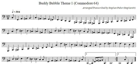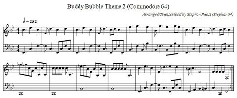 Die musikalische Untermalung besteht aus zwei Melodien, die während des Spiels abwechselnd erklingen. Die nachfolgende Galerie zeigt diese Melodien in der üblichen Notenschreibweise. Für eine kreative Weiterverwendung stehen die Noten auch als PDF-Dokument (Datei:BuddyBubble Theme PDF.pdf) und in der ABC-Musiknotation (Datei:BuddyBubble Theme.abc.txt) zur Verfügung.
