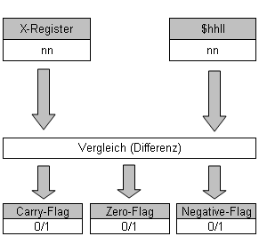Der Assembler-Befehl CPX $hhll vergleicht das X-Register mit dem Inhalt der Speicherzelle $hhll.