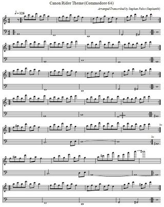 Das nachfolgende Bild zeigt die erste Seite der Titelmelodie in der üblichen Notenschreibweise. Für eine kreative Weiterverwendung der Melodie stehen die Noten auch als PDF-Dokument (Datei:CanonRider Theme PDF.pdf) und in der ABC-Musiknotation (Datei:CanonRider Theme.abc.txt) zur Verfügung.