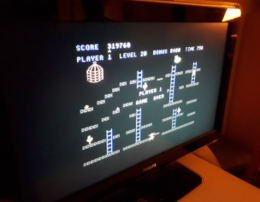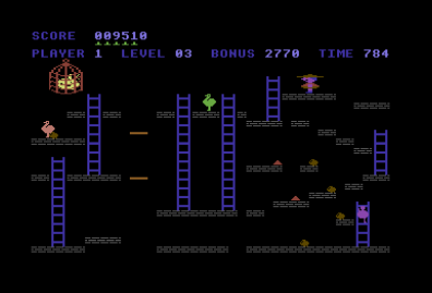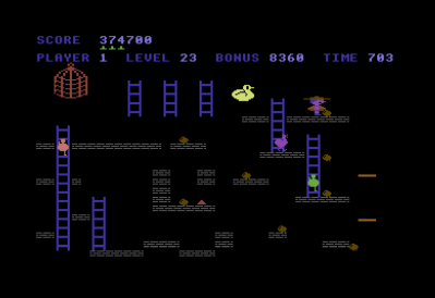 - Ein sehr wichtiges Element ist der Sprung direkt auf eine Leiter. Hält man den Joystick im Flug nach oben oder unten, so kann man bei einem Sprung quer durch den Bildschirm direkt eine Leiter erklimmen. In späteren Leveln sollte man dies unter Druck möglichst oft „on the fly“ einsetzen.