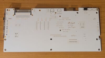 Auf dem Board befinden sich Unterschriften und Namen von Leuten, die an der Entstehung des neuen Commodore, der Entstehung des Commodore 64 Ultimate oder der Entstehung des ursprünglichen Commodore 64 beteiligt waren.