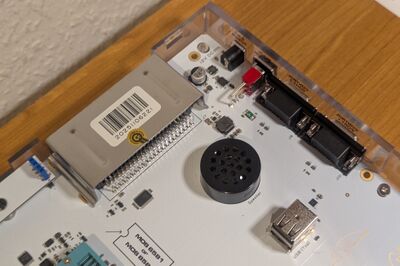 - (ohne Bezeichnung): Zwei ZIF-Sockel für den Einbau von eigenen SID-Chips, die beide klassischen Generationen von SID-Chips aufnehmen (6581 und 8580, siehe Handbuch), und auch für neuere Chip-Nachbauten geeignet sein sollen.