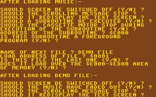Die Software selbst ist menügesteuert (linkes Bild der nachfolgenden Galerie). Die wichtigsten Programmpunkte sind zwei kleine Texteditoren für den Ladebildschirm und die Laufschrift (Punkt A und B), das Beschreiben der Kassette (Punkt E) und eventuell die Konfiguration der Datendichte (Punkt D). Zahlreiche Eingaben, insbesondere zur Begleitmusik oder zu Programmteilen, die später schon während des Ladevorgangs ausgeführt werden sollen, werden erst erfragt, wenn die Kassette zusammengestellt wird (mittleres Bild). Sollen mehrere Kassetten gleichen Inhalts erstellt werden, so macht man die Angaben aber natürlich nur einmal und beantwortet die Frage "DO YOU WISH TO SAVE ANOTHER COPY ?" später mit "Y" (Yes).