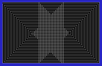 100 HIRES 15,0:PLOT 0,0,0 110 X1=0:X2=320:Y1=0:Y2=200 120 REPEAT 130 DRAW TO X2,Y1,1 TO X2,Y2 TO X1,Y2 TO X1,Y1+5 131 REM:DRAW TO X2,Y1,1 132 REM:DRAW TO X2,Y2,1 133 REM:DRAW TO X1,Y2,1 134 REM:DRAW TO X1,Y1+5,1 140 X1=X1+5 150 X2=X2-5 160 Y1=Y1+5 170 Y2=Y2-5 180 UNTIL Y1>200 190 PAUSE 5