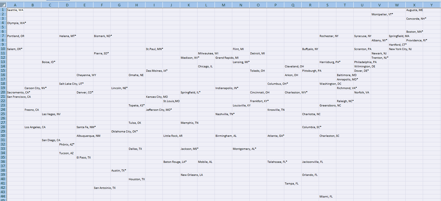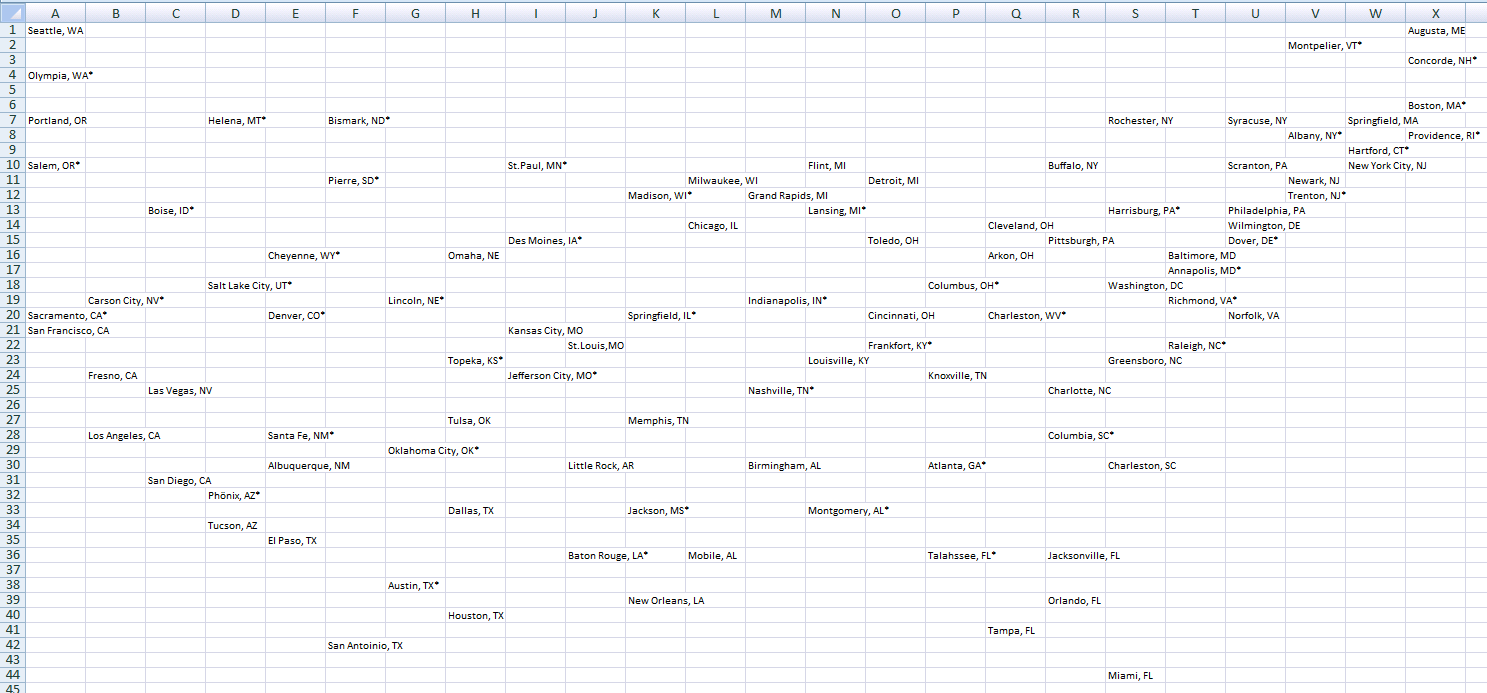 Tabellarisch vereinfachte geografische Lage der Städte in Agent_USA (nicht Maßstabsgetreu)