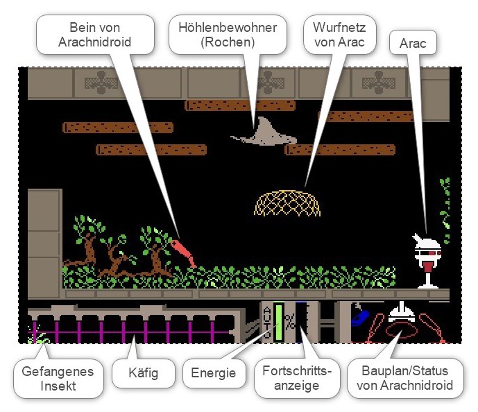 Aufbau der Bildschirmanzeige im Spiel "Arac"