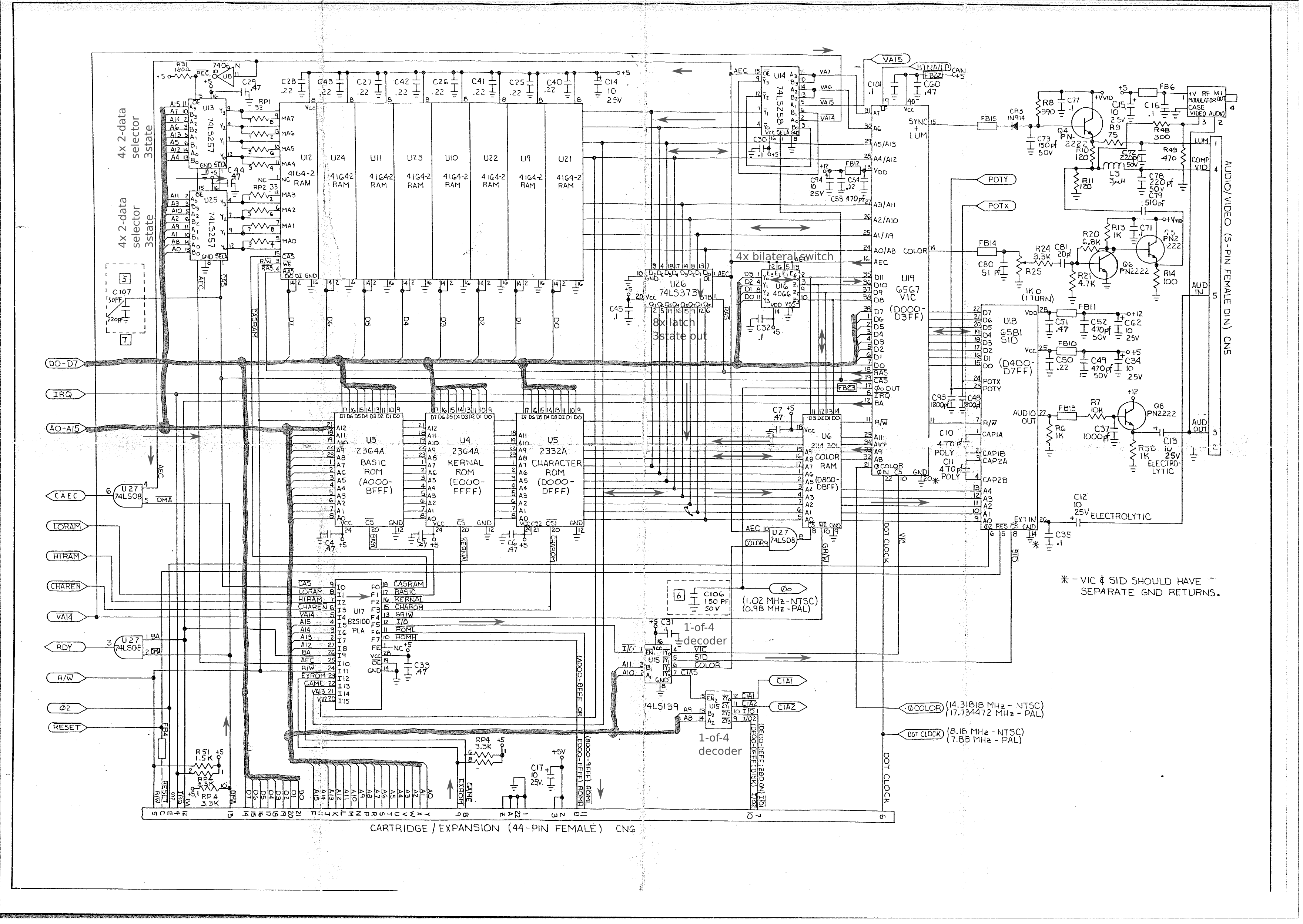 Seite 2 des Brotkasten-Schaltplans (RAM, Farbram, ROMs, PLA, VIC, SID, Expansionsport, Audio-/Video-Schaltung)
