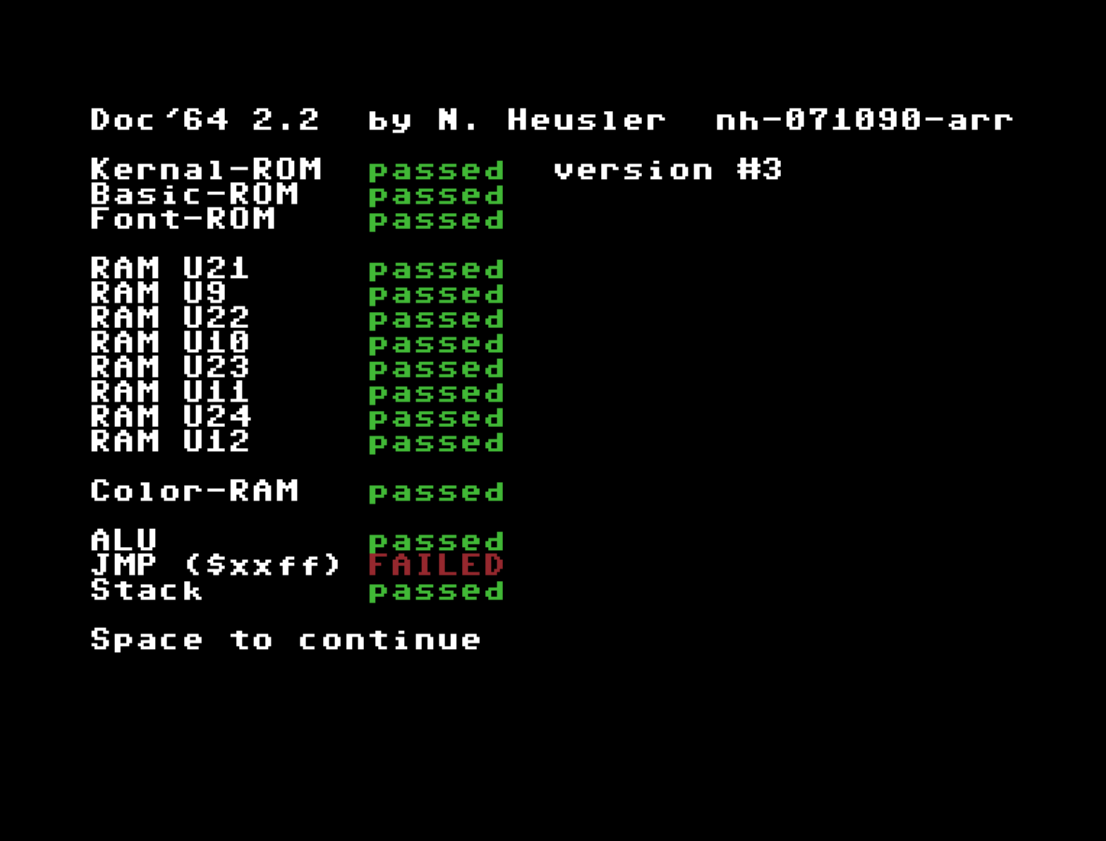 Das Diagnosemodul / Test-Programm DOC64 2.2 zeigt ohne Harness auf der ersten Bildschirmseite dieses Resultat an, bei ansonsten intaktem C64.