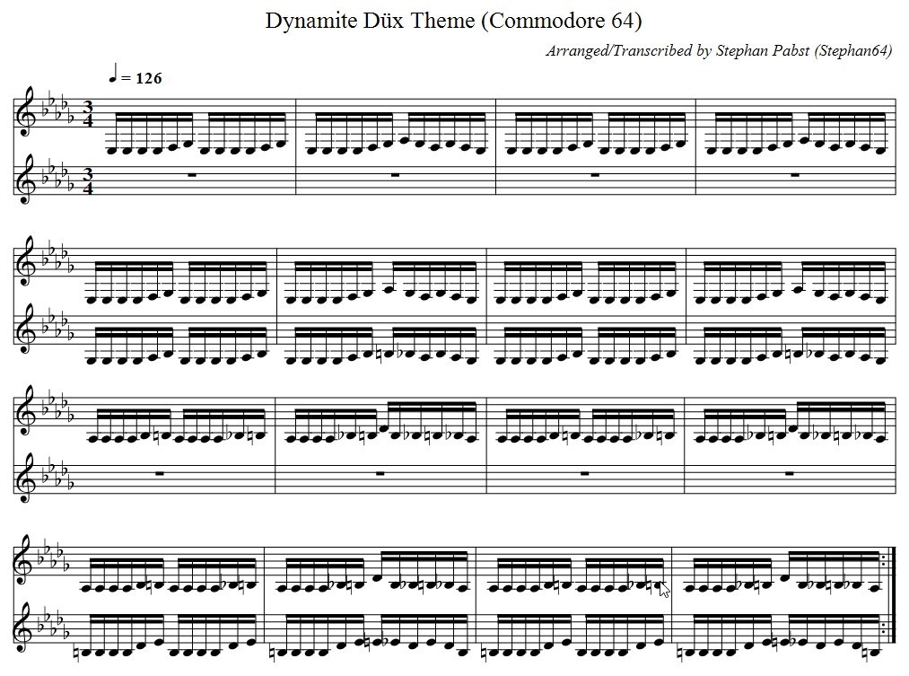 Musiknoten der Titelmelodie zum Spiel "Dynamite Düx"
