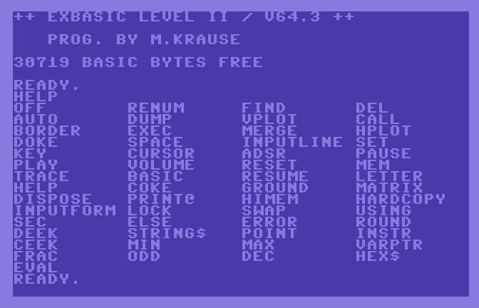 Exbasic Level II (Diskettenversion) Einschaltmeldung und Ausgabe der Befehle mit HELP.