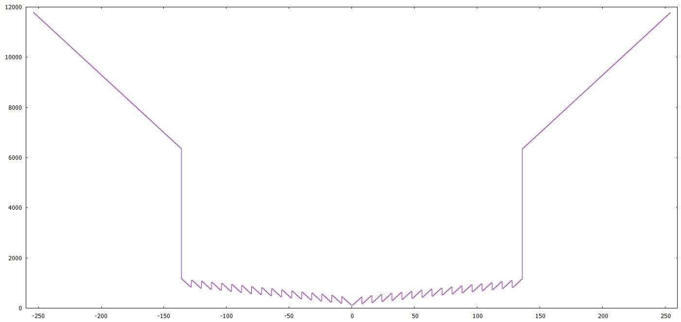 Rechenzeitbedarf der FADD-Routine bei Addition zweier Summanden mit gleichem Vorzeichen, in Abhängigkeit der Differenz der Exponenten