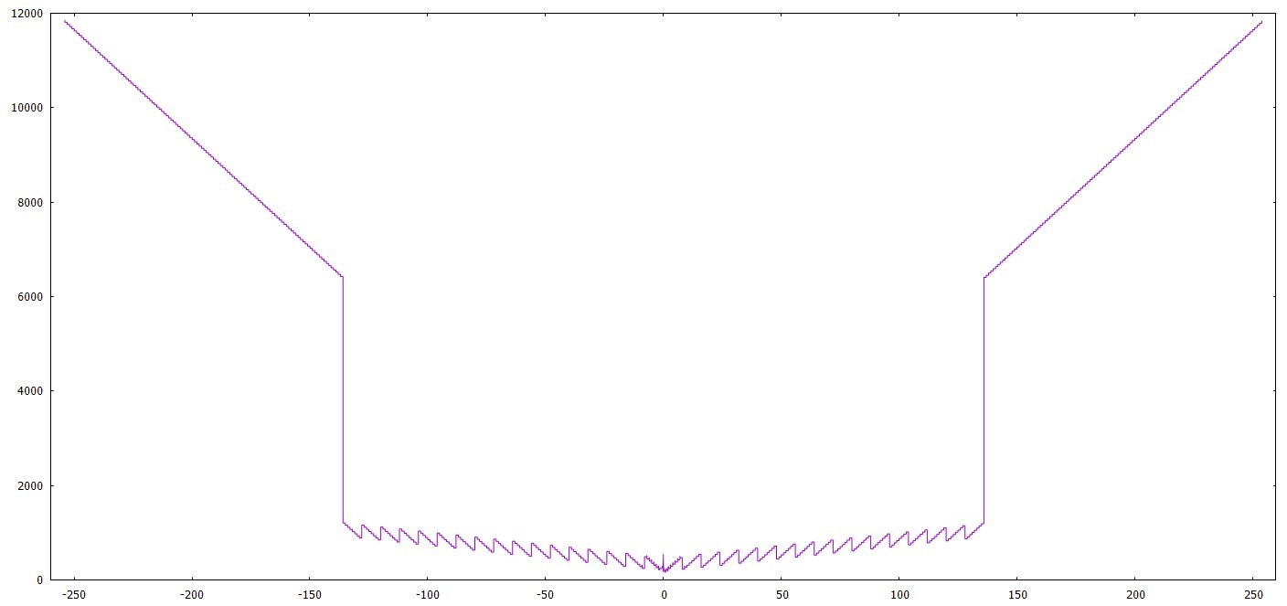 Rechenzeitbedarf der FADD-Routine bei Addition zweier Summanden mit verschiedenem Vorzeichen, in Abhängigkeit der Differenz der Exponenten