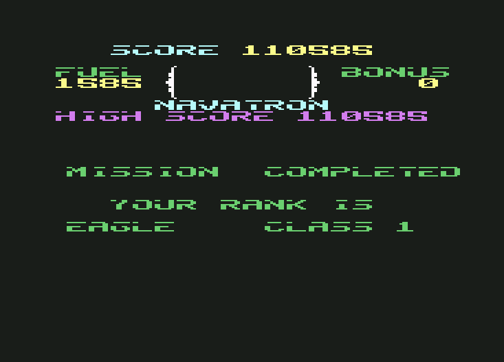 | aktuell | 20:43, 31. Dez. 2025 | 733 × 527 (5 KB) | NSH (Diskussion | Beiträge) | 110585 Points, weak grav, novice pilot, seven lives (died once). High score achieved by shooting tanks repeatedly after blowing up the reactor. Kill tanks, then land inside fuel depot to regenerate tanks, repeat. Takes some patience. If enemy pilot attacks when at fuel depot just stay landed and he will kill himself. The right-hand tanks never fire if you are behind their turn-around point so easiest to just kill those two, regenerate, and repeat. |