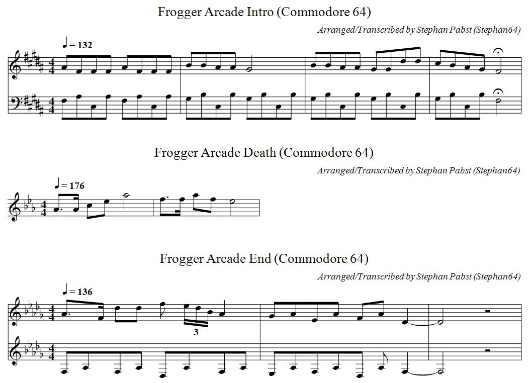 Musiknoten der Melodien bei Spielbeginn, bei Spielende und beim Verlust eines Lebens im Spiel "Frogger Arcade"