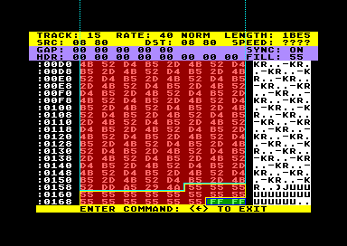 Dargestellt ist die Spur 21 einer Diskette, welche mit dem Commodore DOS formatiert wurde. Die Angezeigte erfolgt durch den MAVERICK - RAMBOard TRACK EDITOR.