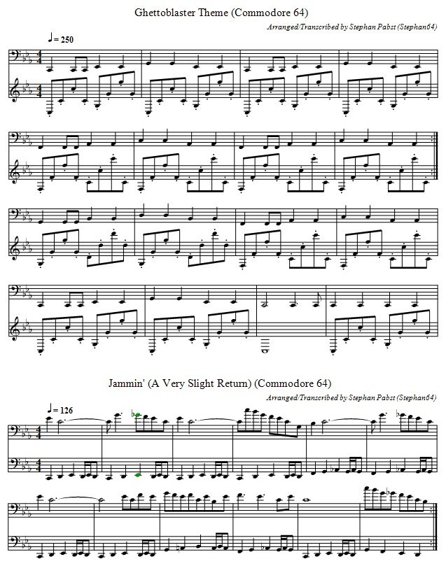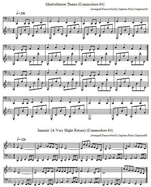 Musiknoten der Titelmelodie und des Musikstücks "Jammin'" aus dem Spiel "Ghettoblaster"