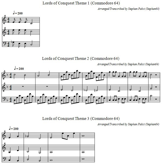 Musiknoten der Begleitmelodien zum Spiel "Lords of Conquest" (erster Teil)