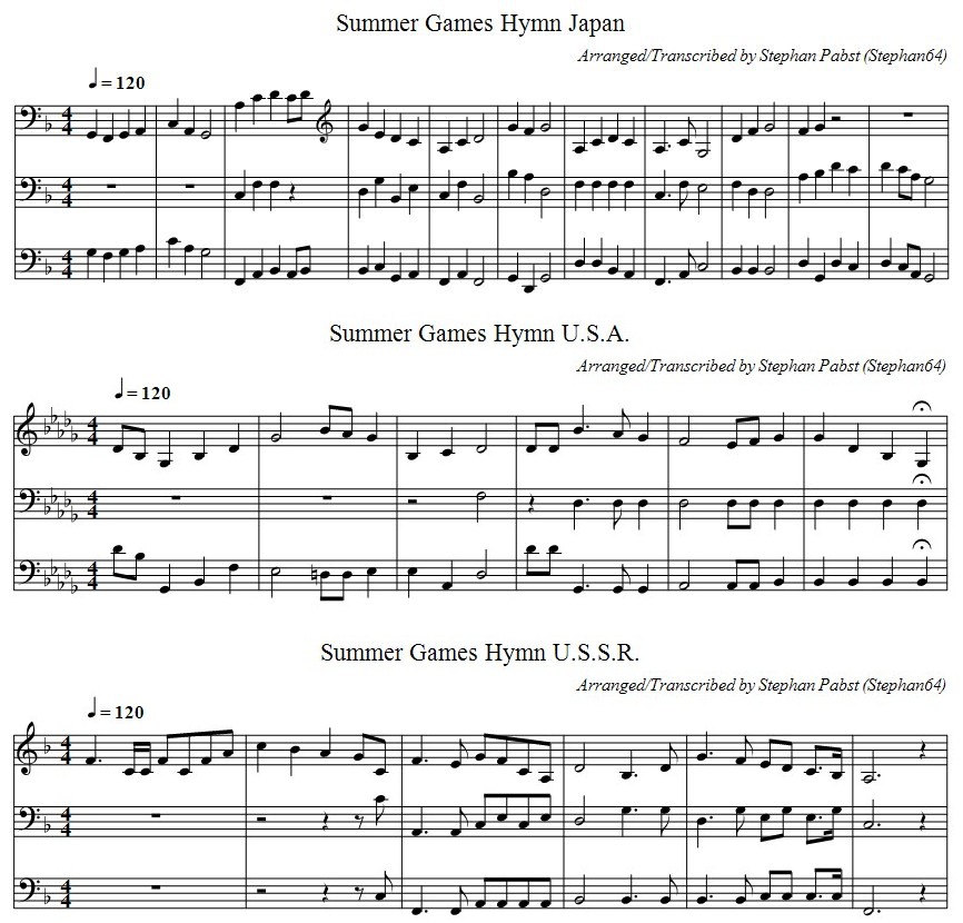 Musiknoten der der Nationalhymnen von Japan, den USA und der UdSSR in den Spielen "Summer Games" und "Winter Games"