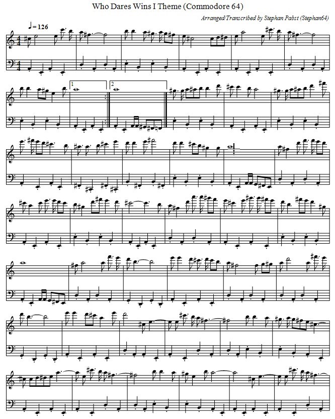 Musiknoten der Titelmusik zum Spiel "Who Dares Wins"