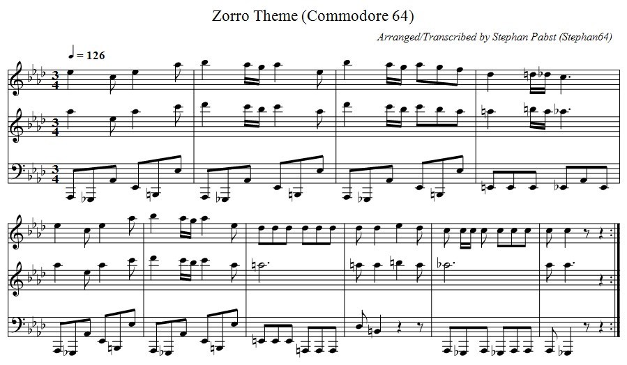 Musiknoten der Titelmelodie zum Spiel "Zorro"